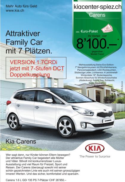 Wer sagt denn, nur Kinder können Eltern bewegen? Der attraktive Family Car begeistert alle Mütter und Väter. Stilvoll mit konkurrenzloser Luxusausstattung und viel Raum für Freizeit, Sport und Reisen. Der Carens überzeugt sowohl mit seiner schön gezeichneten Linie wie auch mit seinen grosszügigen inneren Werten. Und das sicher, komfortabel und sparsam. Carens 1.6 L GDi 135 PS 7-Plätzer ab CHF 26'950.- und mit Kundenvorteil von CHF 8'100.-